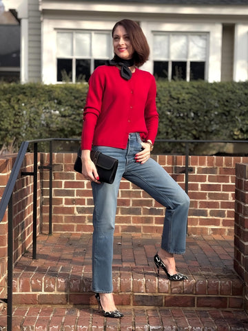 Very cute. Love the pearl buttons. The pearlized button add a dressy touch. I think it would be beautiful over a holiday dress or blouse. That’s exactly how I intend to wear it.