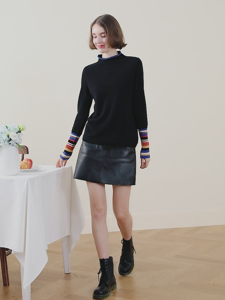 100% Cashmere Women's Knit Sweater with Colorful Cuffs