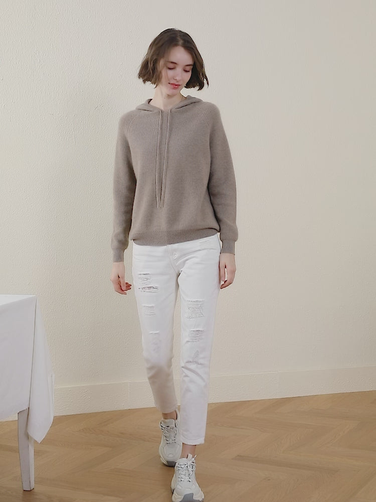 This cashmere hoodie features a relaxed, casual design with a hooded neckline. The drawstring detail not only adds to the casual aesthetic but also accentuates and flatters the neckline, providing a stylish and comfortable fit.