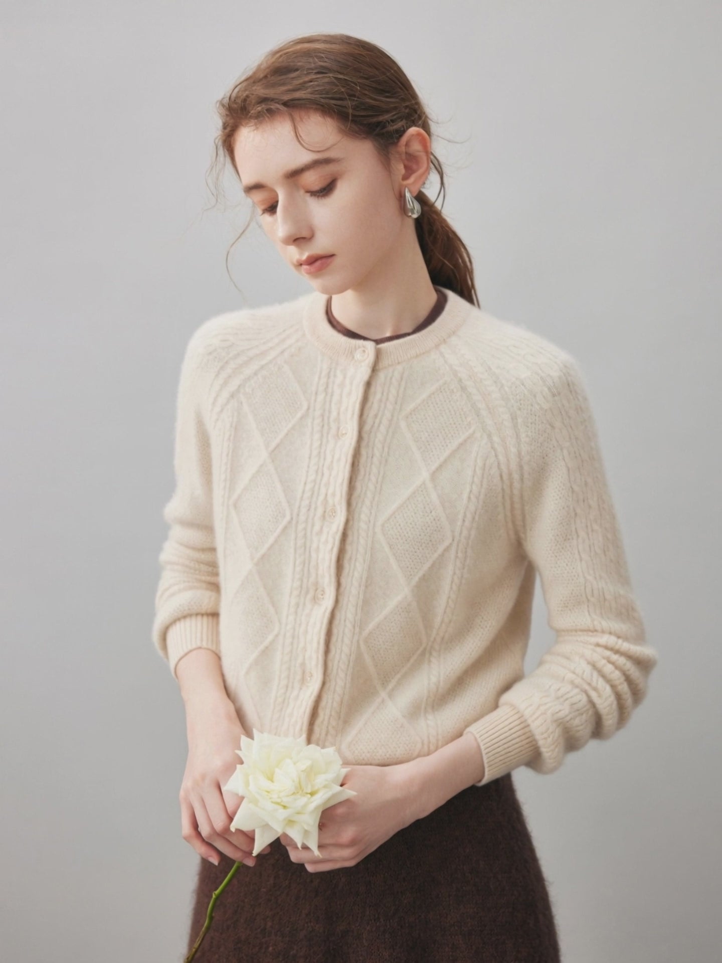 100% Cashmere Women's Argyle Cable Button Up Knit Cardigan