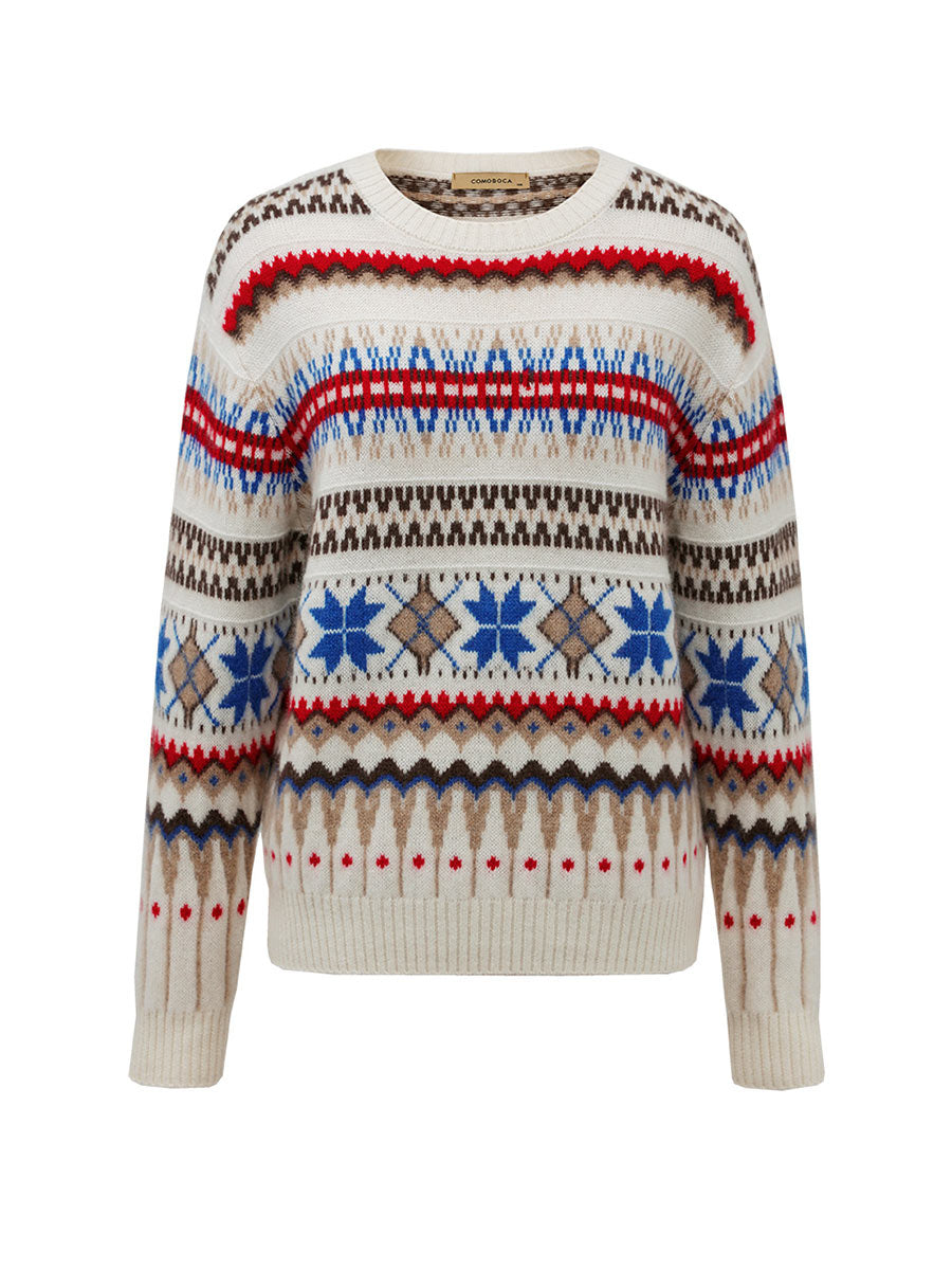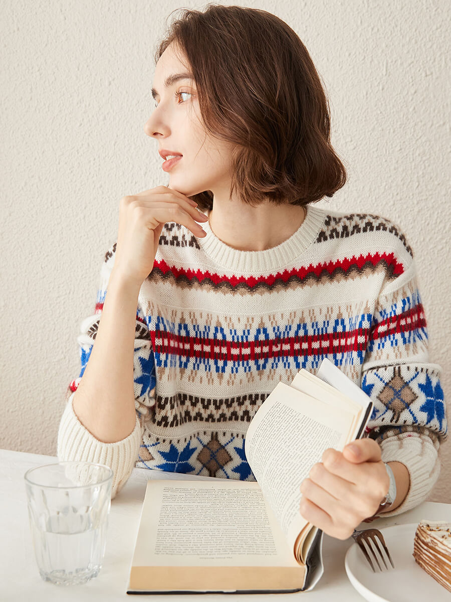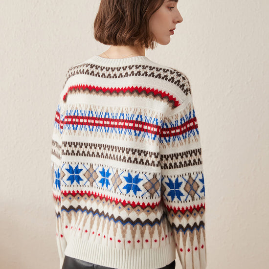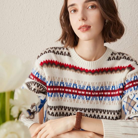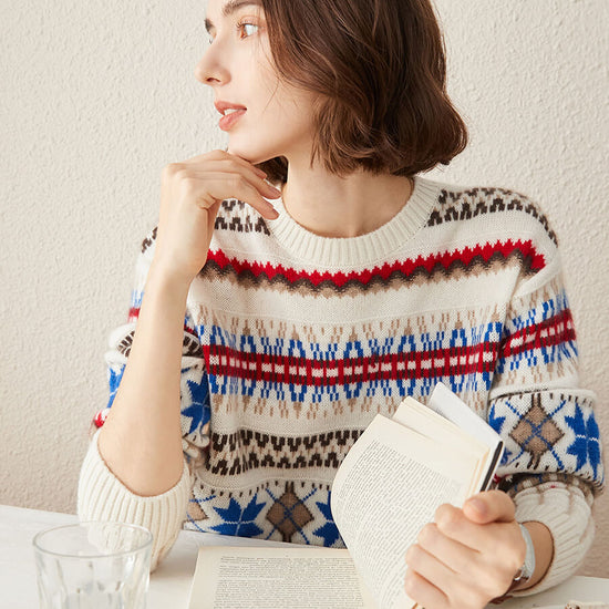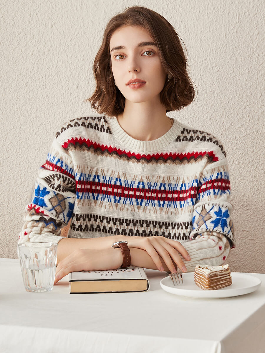 Embrace cozy, vintage-inspired style with our Women's Nordic Fair Isle Knit Sweater. Crafted from soft, warm knit cashmere, its classic crew neck and relaxed fit make it perfect for layering, adding a touch of rustic charm to casual or seasonal outfits.