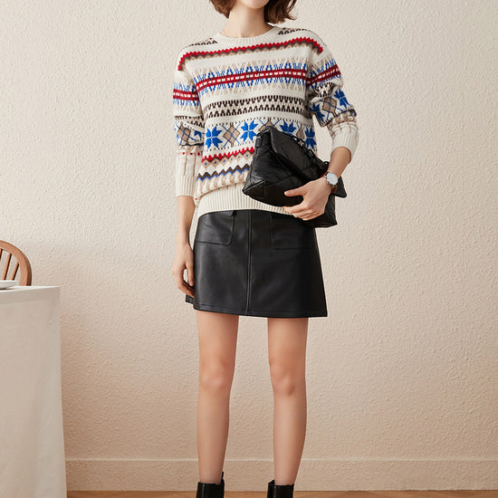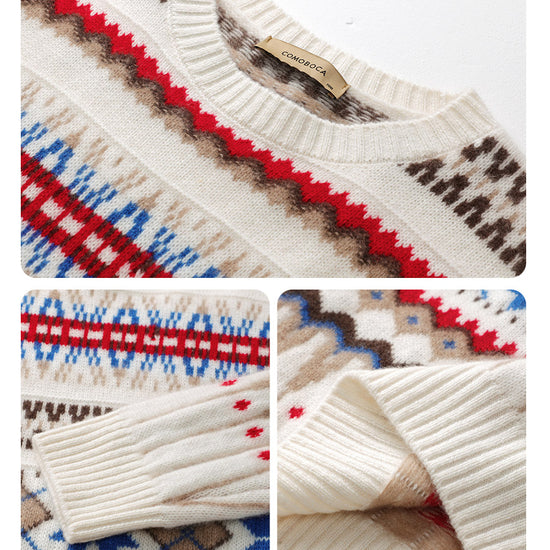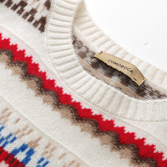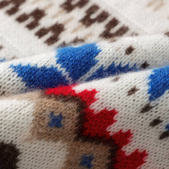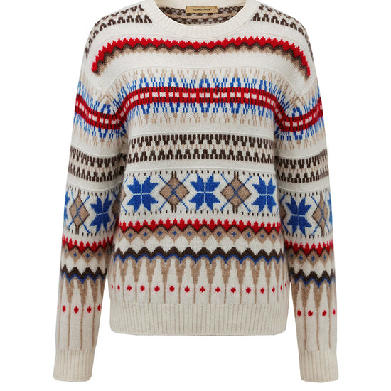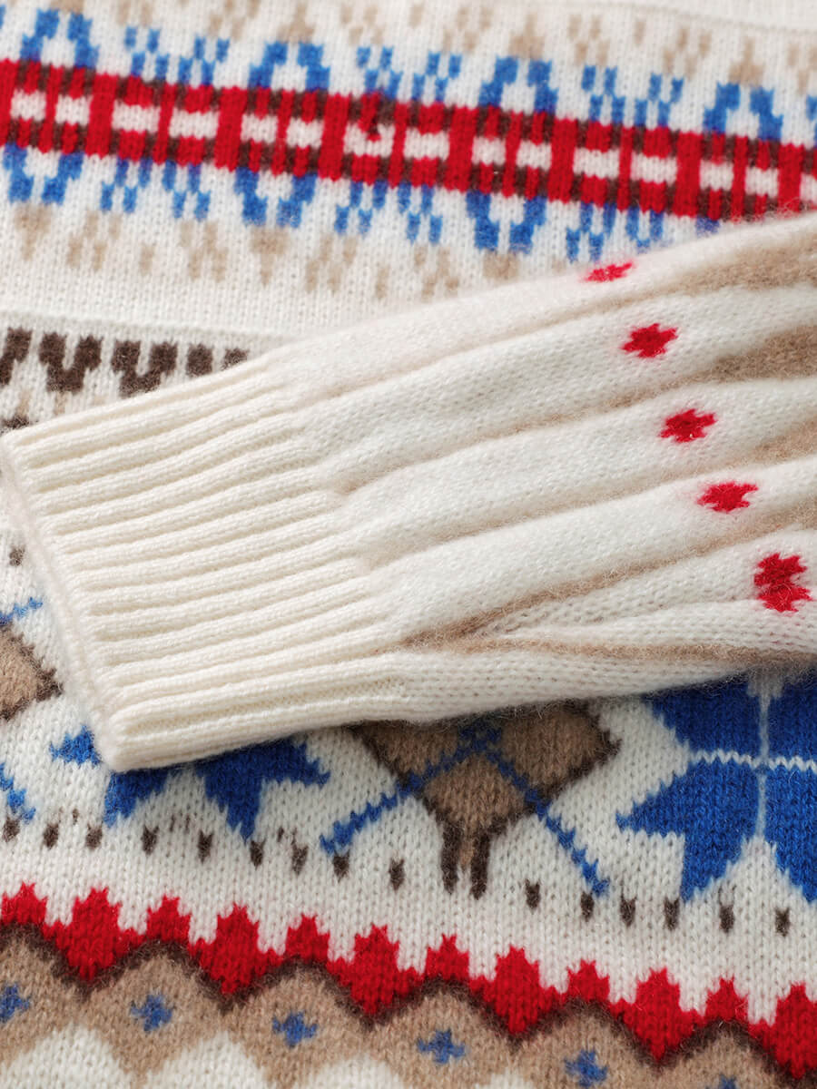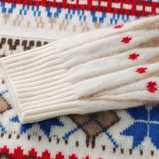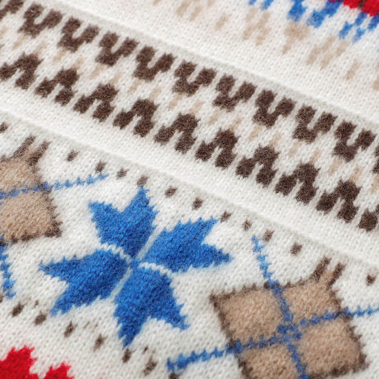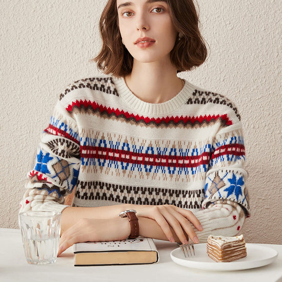 Embrace cozy, vintage-inspired style with our Women's Nordic Fair Isle Knit Sweater. Crafted from soft, warm knit cashmere, its classic crew neck and relaxed fit make it perfect for layering, adding a touch of rustic charm to casual or seasonal outfits.