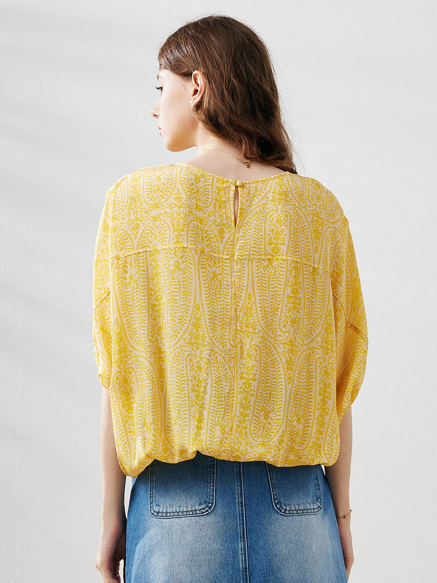 100% Mulberry Silk Women's Floral Printed Puff Sleeve Blouse