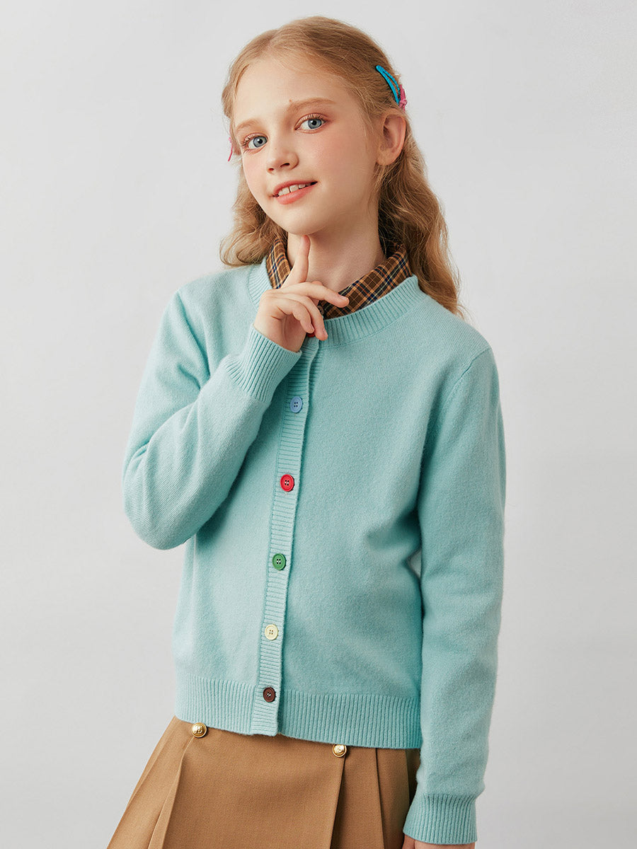 100% Wool Kids' Colorful Buttons Round Neck Cardigan