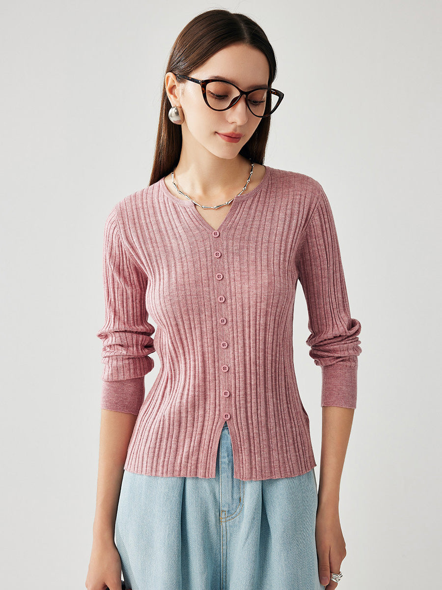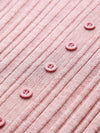 This ribbed V-neck sweater is the perfect blend of style and comfort, designed for effortless wear and layering. The vertical ribbed knit enhances the fit, creating a flattering silhouette, while the soft wool blend provides all-day comfort. The buttons are for design only, giving the sweater a sleek, button up appearance without any actual closures. The delicate pink hue adds a feminine touch, making it a versatile piece to pair with skirts, jeans, or trousers.