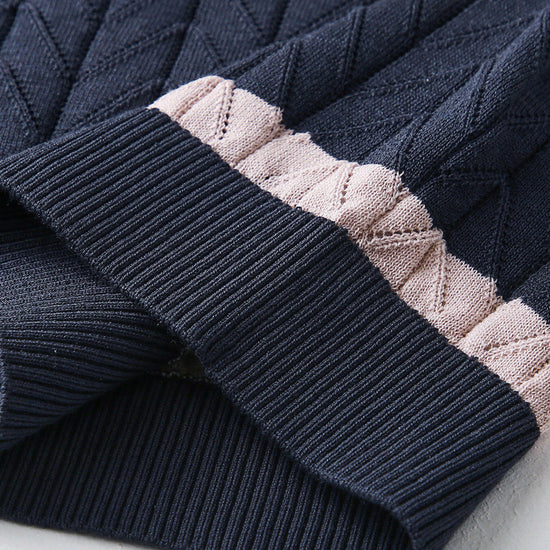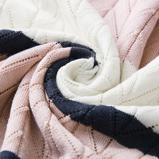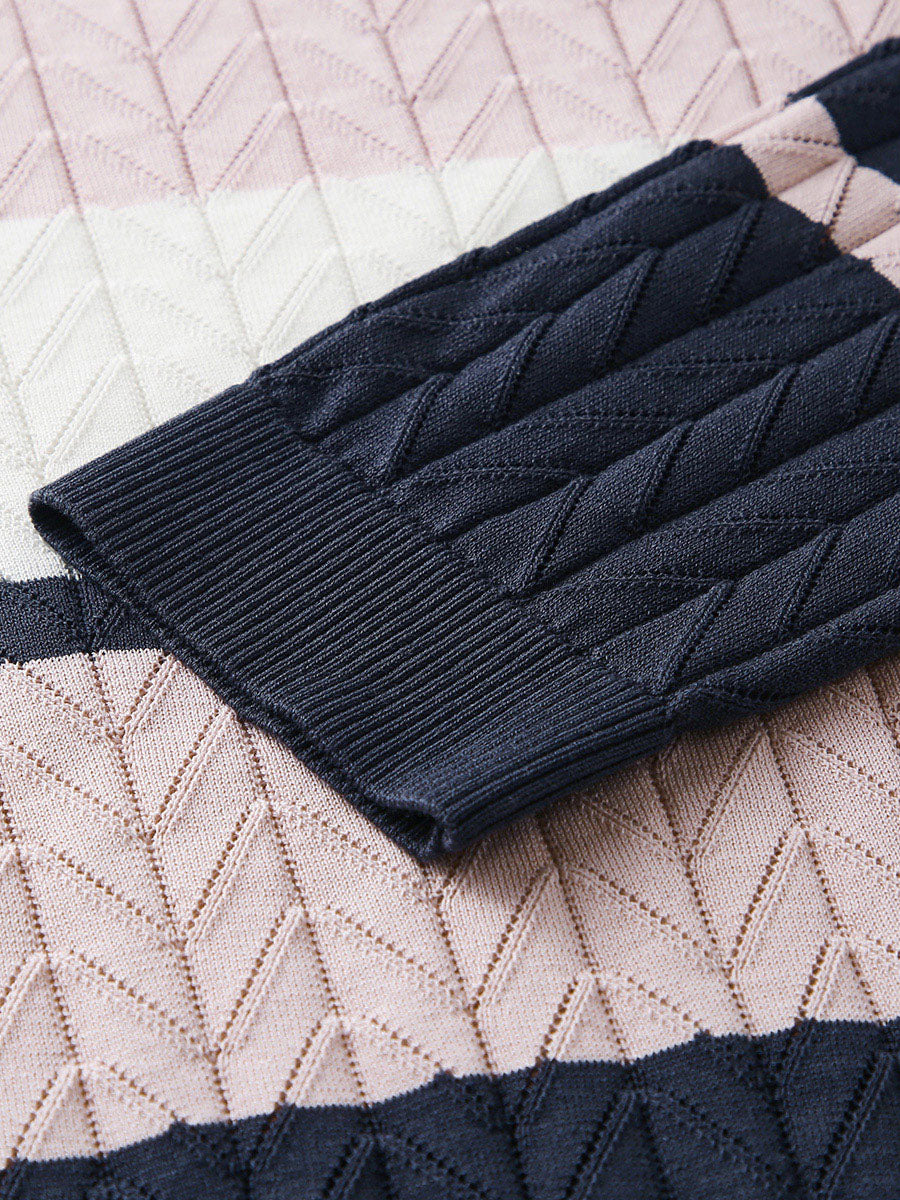 - Color Block Design: Bold alternating stripes in navy, light blue, cream, and pink.